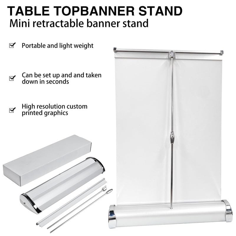 - Mini Table Banner Stand --- Our retractable banner is made of high-quality aluminum alloy, which is durable and will not fade.