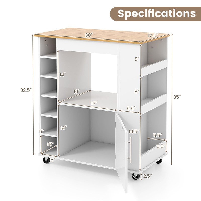 LOKO Mobile Kitchen Island with Storage, Rolling Microwave Cart with Bamboo Top, 6-Bottle Wine Rack, 3 Tier Spice Rack, Kitchen Cart with Towel Rack on Wheels, for Dining Room Coffee Bar, White