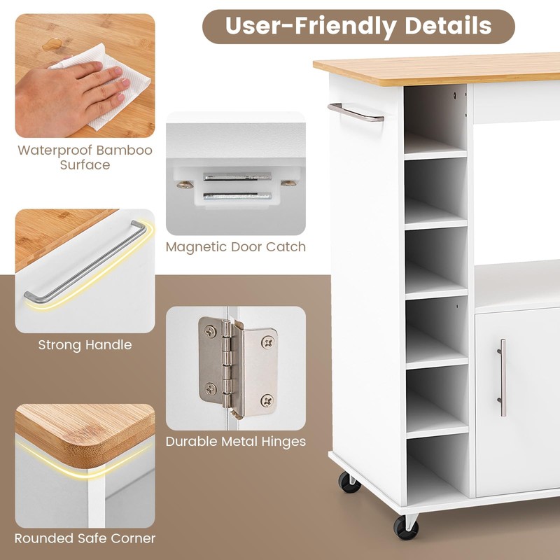 Enhance your cooking and entertaining experience with this essential kitchen accessory with various storage solutions to meet all your kitchen needs. Designed with a wide counter top, convenient open shelf, 6-tier wine rack, side seasoning rack, cabinet and a towel rack, this cart offers ample storage space for wine, washcloths, tableware, food, bowls, and dishes. In addition, crafted with bamboo and MDF board, this kitchen cart is built to withstand daily use. Moreover, facilitating flexibility and mobility in your kitchen, this cart is equipped with 360° universal wheels, and the 2 lockable wheels, allowing you to firmly secure the cart in place whenever needed. Add practicality and style to your kitchen with our versatile and user-friendly kitchen cart!