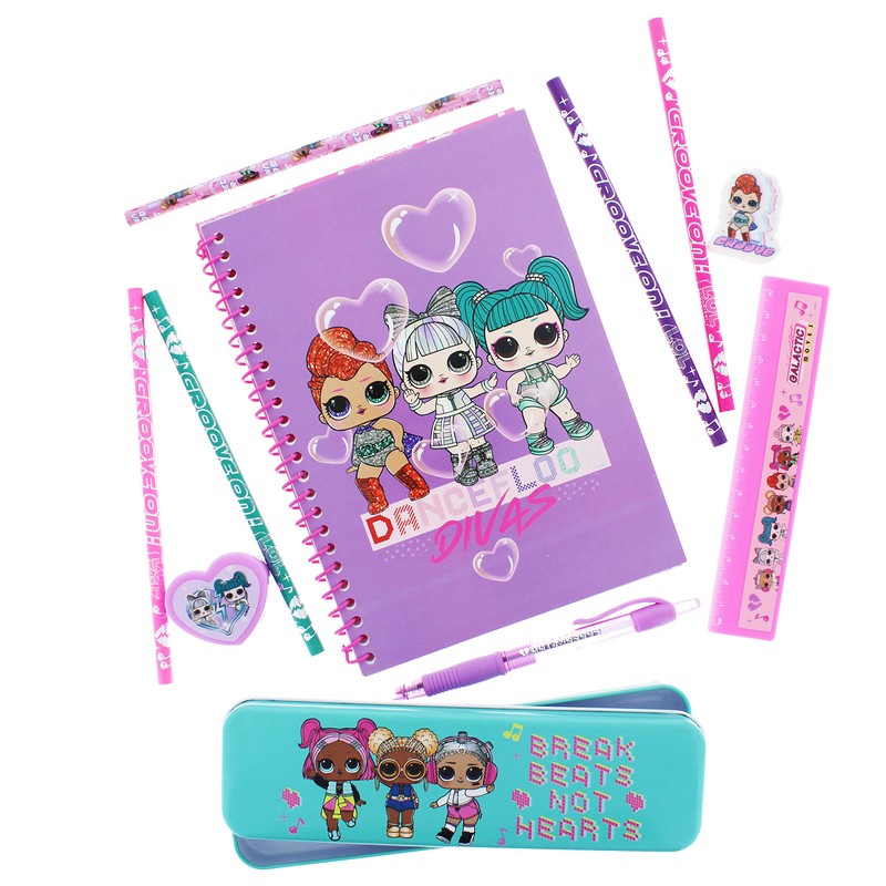 - 👧 SCHOOL SET: This super stationery set contains lots of cute items that all LOL fans will love. Contains 1 x A5 wirebound notebook, 1 x pencil tin, 1 x ruler, 1 x writing pencil, 1 x ballpen, 4 x colouring pencils, 1 x eraser and 1 heart shaped sharpener. Packed in a printed zip lock wallet making it easier to take for travelling and taking to school.