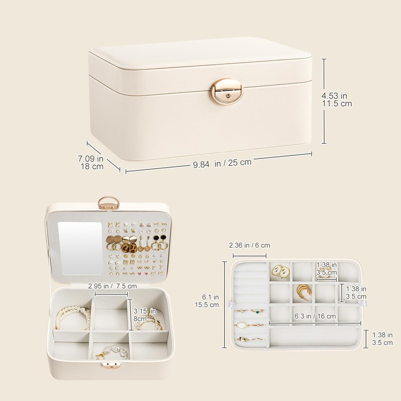 - Built-In mirror makes it easier to dress yourself, middle tray with side handles for easy removal, compact size 9.84" x 7.09" x 4.33", large capacity can store all your jewelry