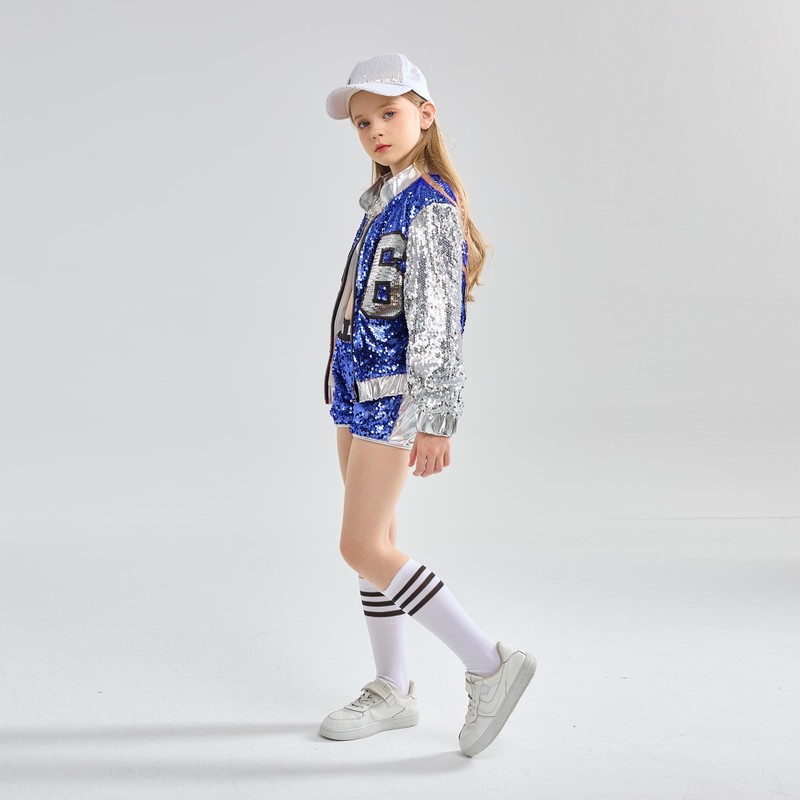 LOLANTA 4 Pieces Girls Hip Hop Dance Costume Kids Sequins Jazz Dance Clothing Set Socks Attached 4-15 Years, blue