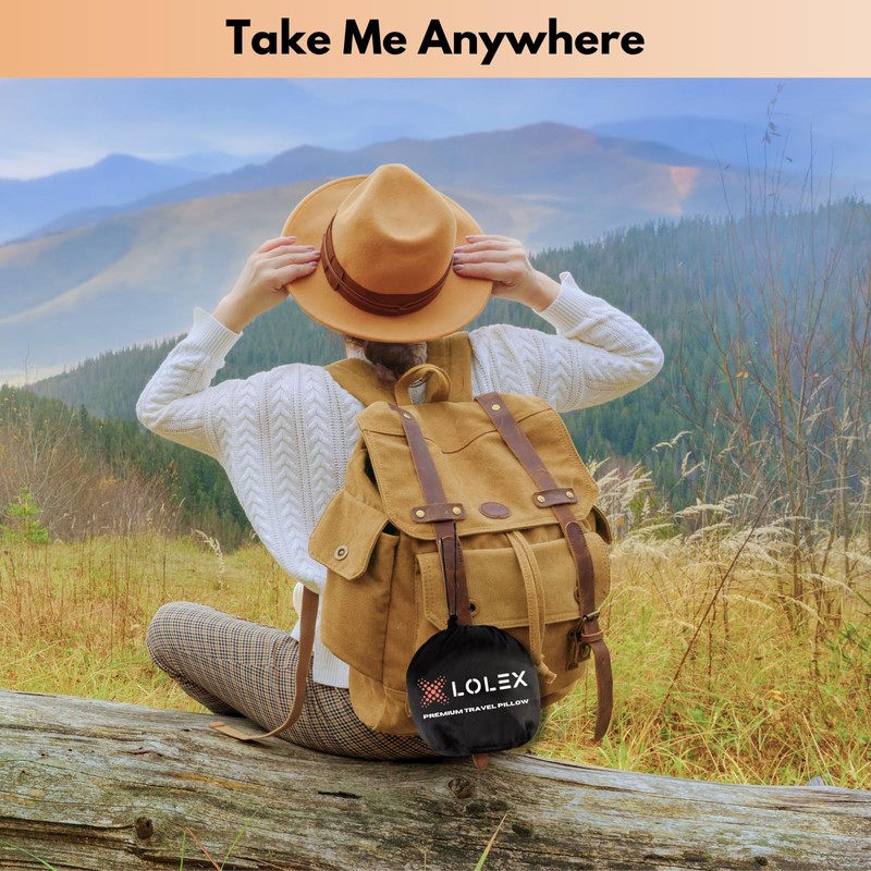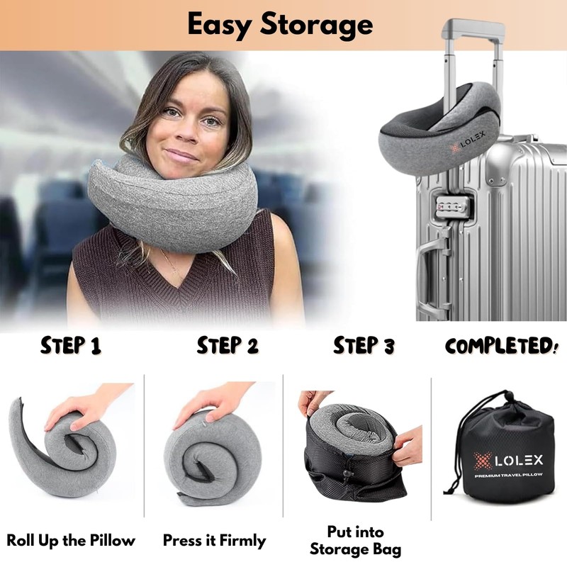 - đăPORTABLE AND CONVENIENTă: Designed for easy travel, the LOLEX Travel Neck Pillow for Airplane can be compressed into a compact form and stored in the included luxurious mesh carry bag. This bag easily snaps onto your luggage, making it convenient to carry around and perfect for airplane travel, car rides, or camping trips.