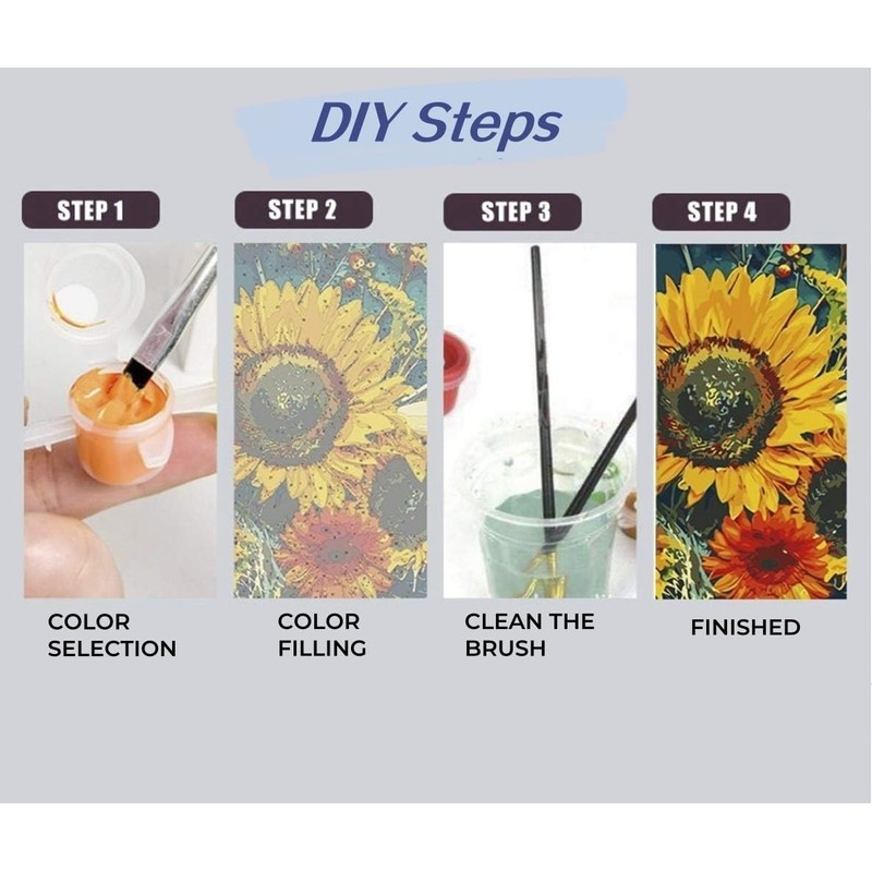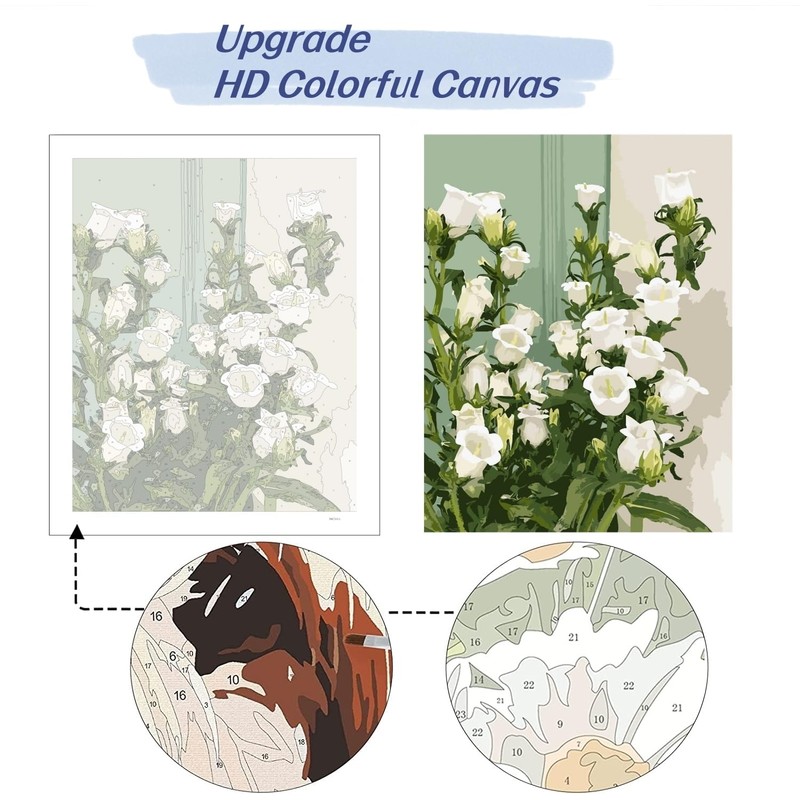 - What You Get: The painting by numbers set includes 1 pre-printed textured canvas (without frame), 1 set of acrylic paints, 3 brushes.