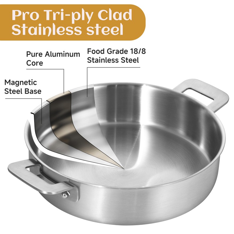 - Tri-Ply Stainless Steel:All Lolykitch stainless steel cookware made with a high-purity aluminum core sandwiched between 2 layers of durable stainless steel, excellent durability for year to come.High polished food grade stainless steel for cooking surface,plus won't adverse react with food to alter natural tastes.