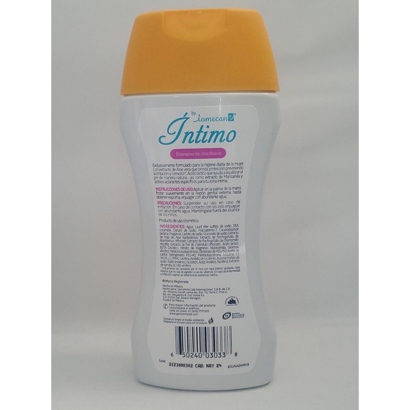 Intimo by Lomecan Shampoo de uso diario Higiene y proteccion intima diaria..... { 2 Bottles Lomecan Intimo ACLARANTE } Activos aclarantes especificos para tu zona intima ________________________________________________________________________________________________________________________ Acido lactico equilibra el pH natural Cont. Neto: 200 ml Intimo by Lomecan shampoo ayuda a mantener en perfectamente en balance el pH de nuestra zona íntima que puede ser muy sensible con el uso de productos que no estén recomendados. Así que para mayor información se recomienda visitar a un especialista que pueda ofrecer una mejor y profesional valoración sobre nuestra salud íntima y nos ayude a escoger el mejor producto que se adecue a nuestra zona íntima IngredientesAgua, lauril éter sulfato de sodio, DEA cocamida, cloruro de sodio, policuaternio 7, lactato de sodio, gluconato de sodio, cocamidopropil betaína, fragancia, extracto de hoja de aloe barbadensis, extracto de flor de rosmarinus officinalis, extracto de flor de chamomilla recutita, extracto de flor de caléndula officinalis, ácido EDTA, diestearato de PEG 150, niacinamida, glicerina, nitrato de magnesio, alcohol, metilcloroisotiazolinona, cloruro de magnesio, aceite de castor hidrogenado, PEG 40, metilisotiazolinona, arbutina, lecitina, ácido linoléico, acetato de tocoferilo, ascoril fosfato de sodio, glutatión tocoferol, extracto de la semilla vitis venifera. Free USPS First Class shipping in the USA!!!!! |