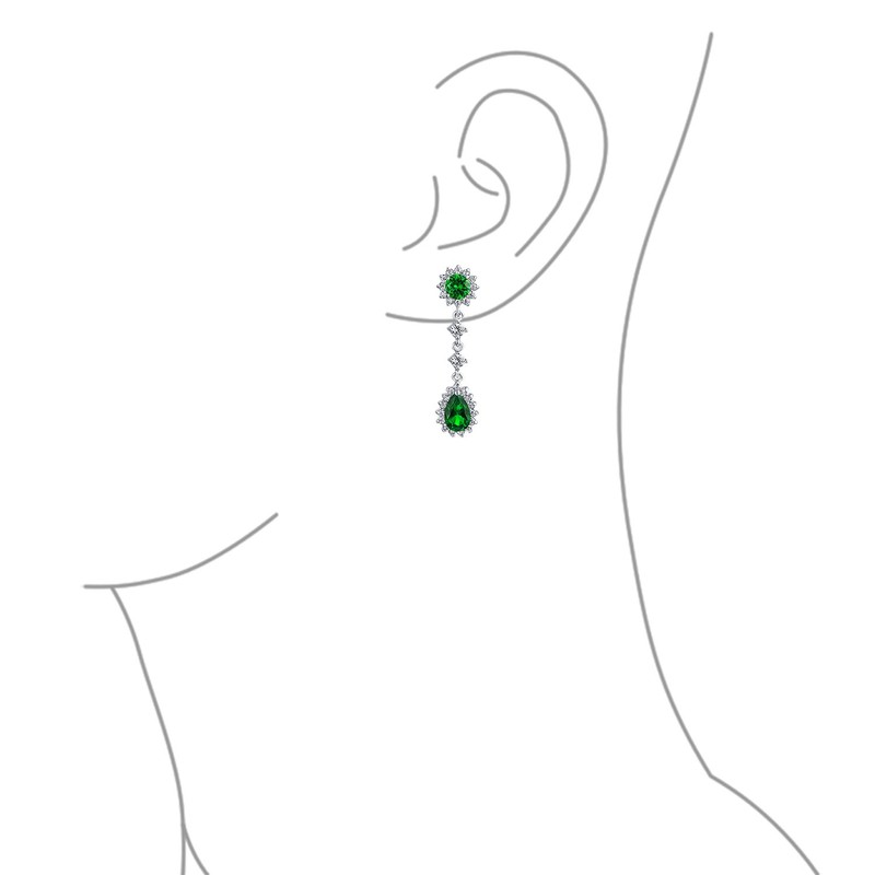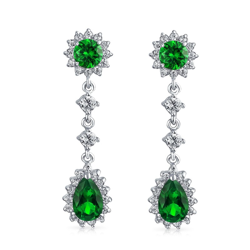 - Elegant design – Epitomize royal glamour in this amazingly beautiful, bridal drop clip earrings for evening wear for non-pierced ears. Green simulated emerald prongs of the birth month of May with a teardrop halo prong at the bottom and a round serrated stone at the top.