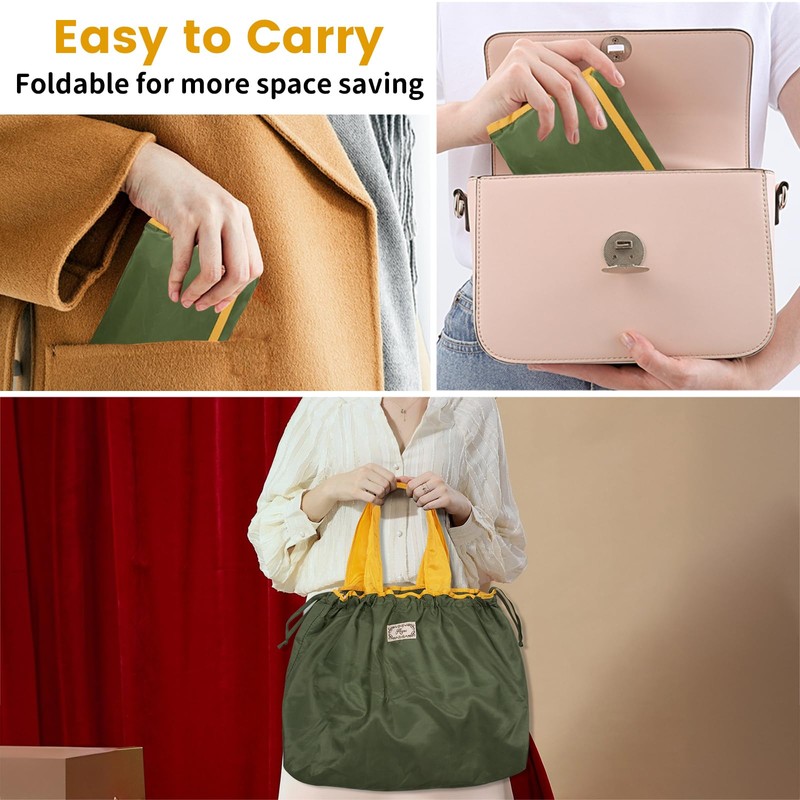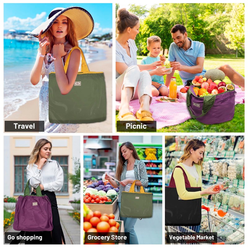 - MULTIPURPOSE - Our foldable takeaway bags are versatile and easy to carry for daily shopping, and are durable enough to hold fruits, clothes, etc. These shopping bags are designed with a special hidden soft handle: when you put food in, pull out the handle and tie, you get a drawstring bag. Use it to bring lunch to the office, for picnics, travel and camping, it is very practical.