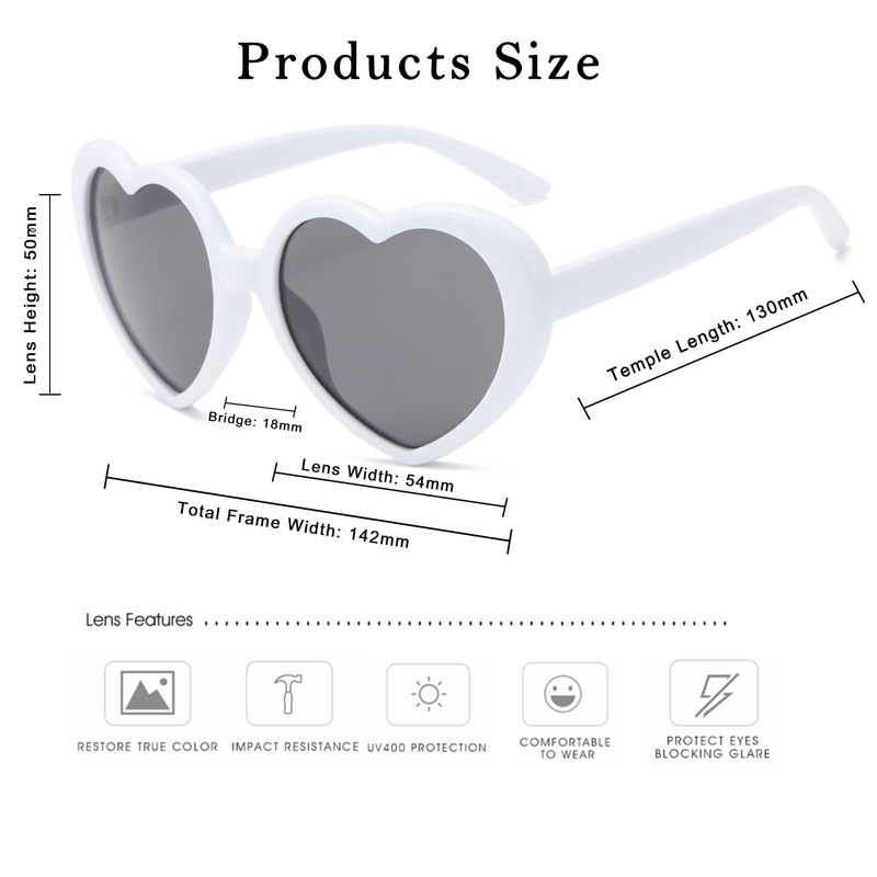 - Product Dimensions - Lens Height: 50mm (1.97") Lens Width: 54mm (2.13") Nose Bridge Width: 18mm (0.71") Glasses Arm Length: 130mm (5.12") Frame Width: 142mm (5.59") Package includes: 1 x polarised heart sunglasses; 1 x soft glasses bag; 1 x glasses cleaning cloth; 1 x polarisation test card.