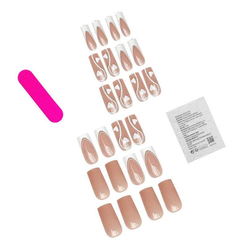 - Package Include: One box, containing 24pcs Valentines fake nails in 12 different sizes, a sheet of 24 jelly adhesive tabs, a nail file, a wooden stick, and a packet of alcohol wipes.