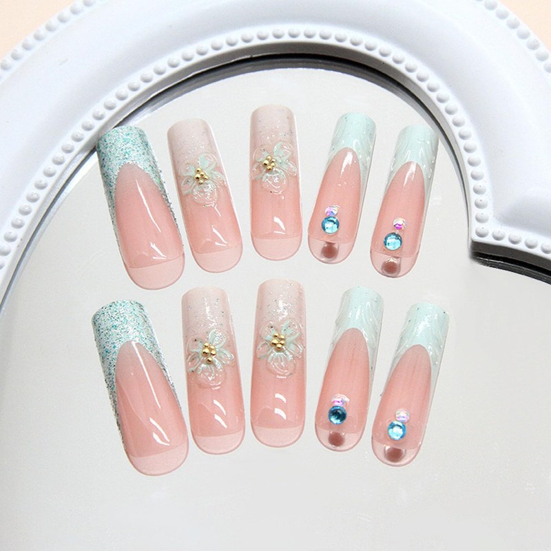 Long Press on Nails Light Green French Fake Nails with Square Designs 3D Flowers Rhinestones Acrylic Nails Glossy Glitter Translucent Glue on Nails Summer False Nails for Women 24 Pcs