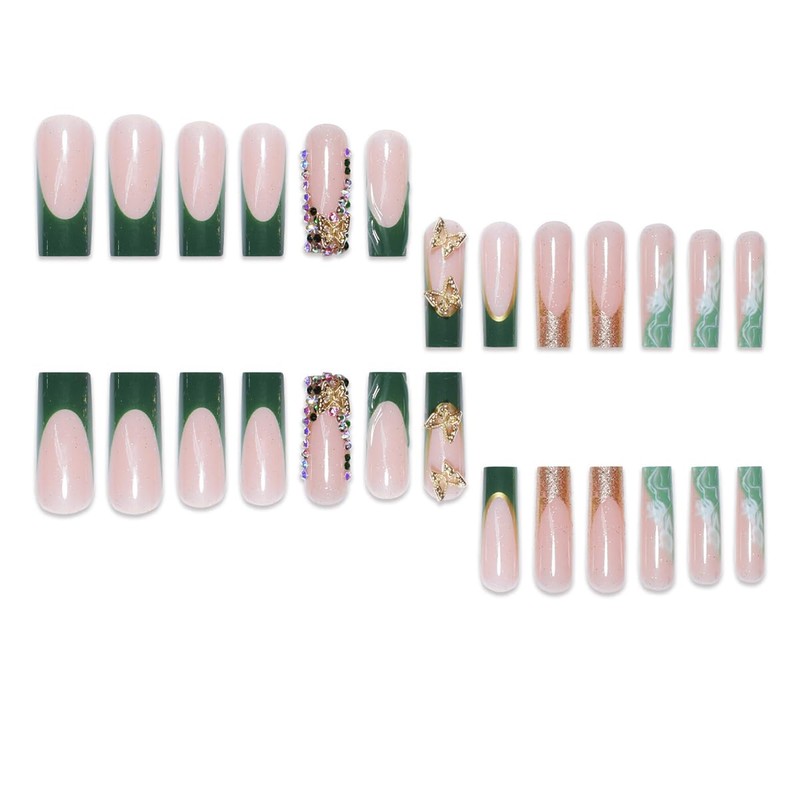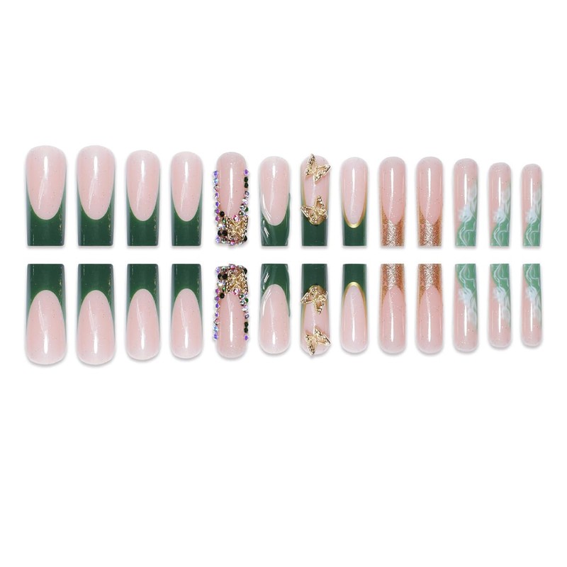 Long Square Press on Nails Green French Tip Fake Nails with 3D Gold Butterfly...