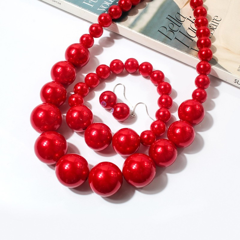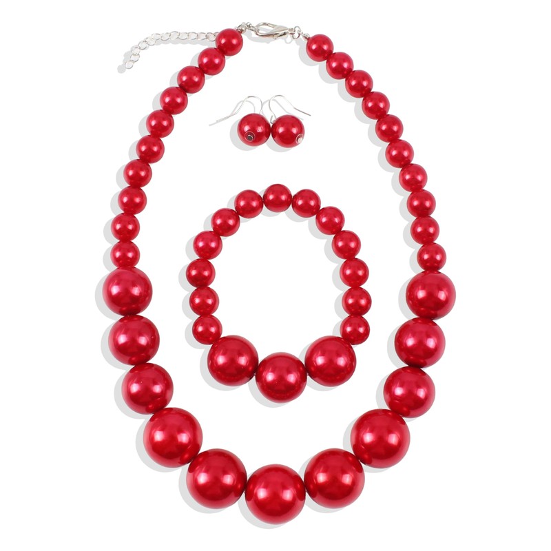 Long tiantian Pearl Choker Necklace Chunky Pearl Statement Necklace Bracelets Earrings for Women Trendy Red/White/Pink Mrs Roper Jewelry Set for Women Bridal Accessories