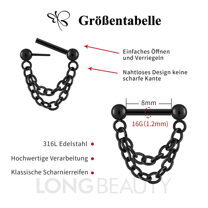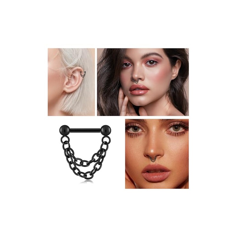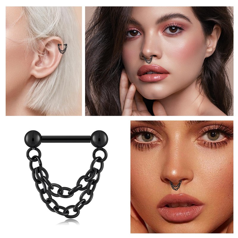 Longbeauty 16G Septum Piercing Chain Nose Piercing Threadless Push-in Septum Barbell Nose Rings Daith Tragus Cartilage Helix Ear Piercing Jewellery, Stainless Steel