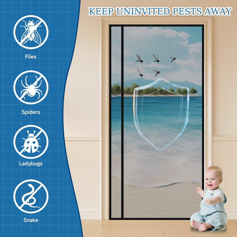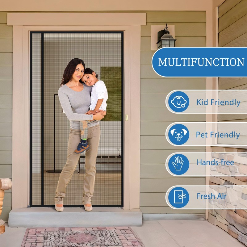 • Kid and Pet Friendly: This is a kid and pet friendly magnetic door screen, children and pets can freely and easily enter and exit the house without the help of hands, the retractable screen door will automatically close, and insects cannot enter