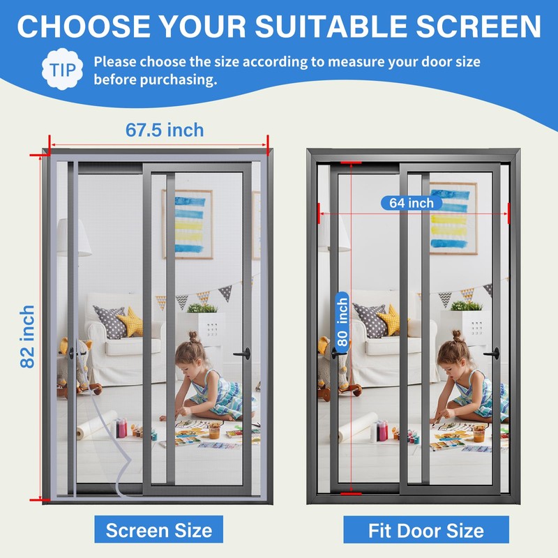 - Quick Installation: The screen size 67.5*82, fit door size 64*80. Magnetic screen door for Sliding Doors, Double Doors, French Doors, etc .You only need to follow the steps in the instructions to quickly install it. Tips: Please measure your door twice before installation to find the most suitable installation position