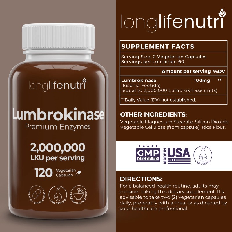 LongLifeNutri Lumbrokinase 100mg – Maximum Activity 2,000,000 Units Per Serving