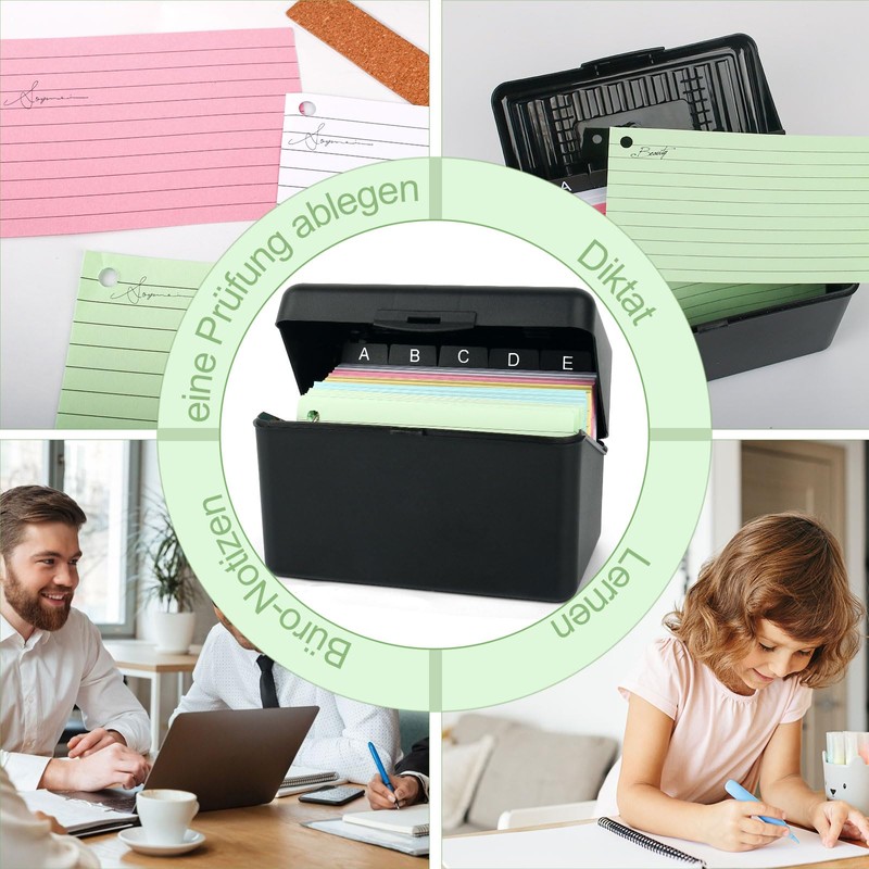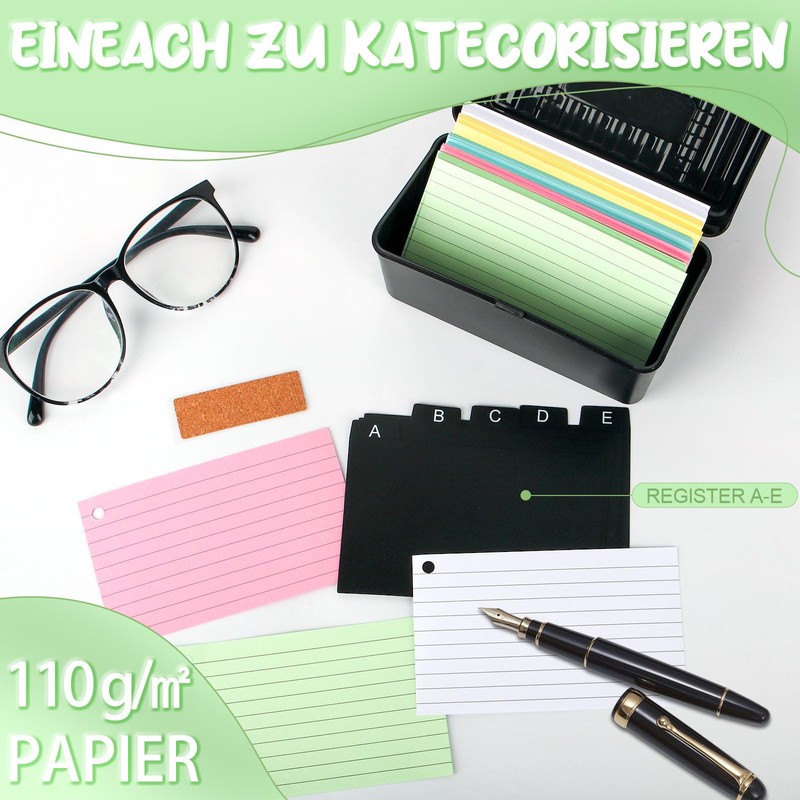 - Index cards with box set: 1 black index card box, 250 coloured index cards with holes, 5 index index cards from A-E, 6 binder rings and 1 kraft paper sticker. Our index card box is a true all-rounder