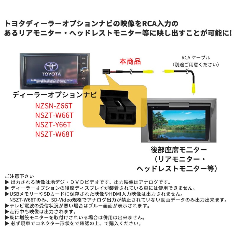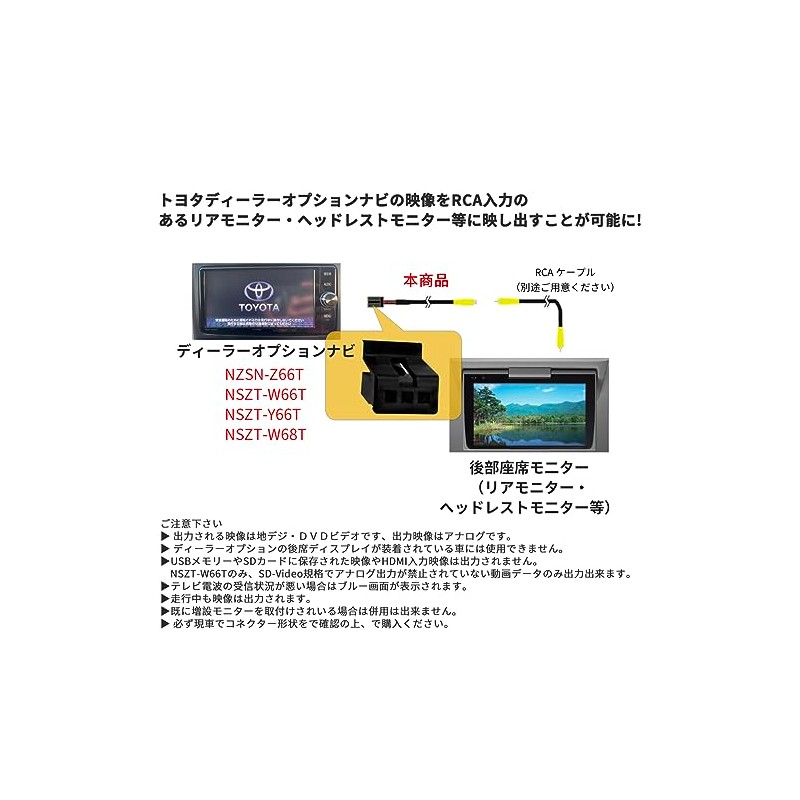 - Product Description: Video output harness for Toyota monitor enhancement. The video of your Toyota dealer option navigation can be displayed on a rear monitor, headrest monitor with RCA input
