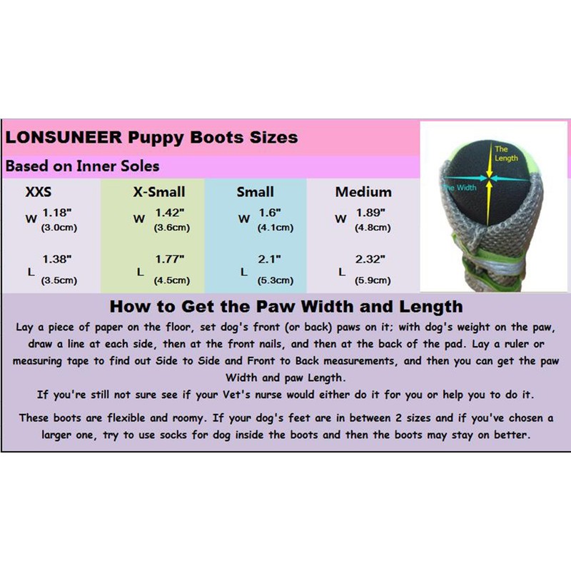 - Size Small: Inner Sole Length 2.1 inch, Inner Sole Width 1.6 inch, one set of 4 boots