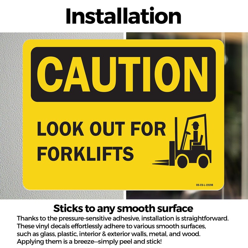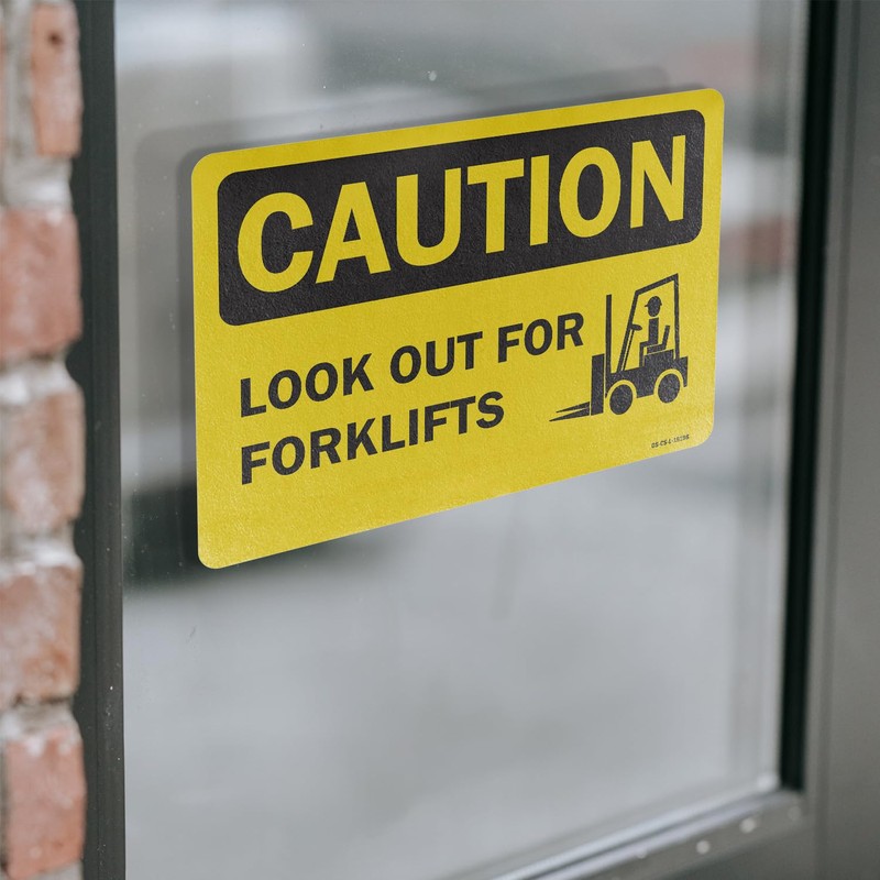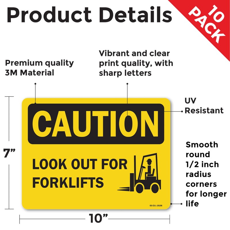 Look Out For Forklifts OSHA Caution Vinyl Decal Label 10 Inch x 7 Inch - 10 Pack