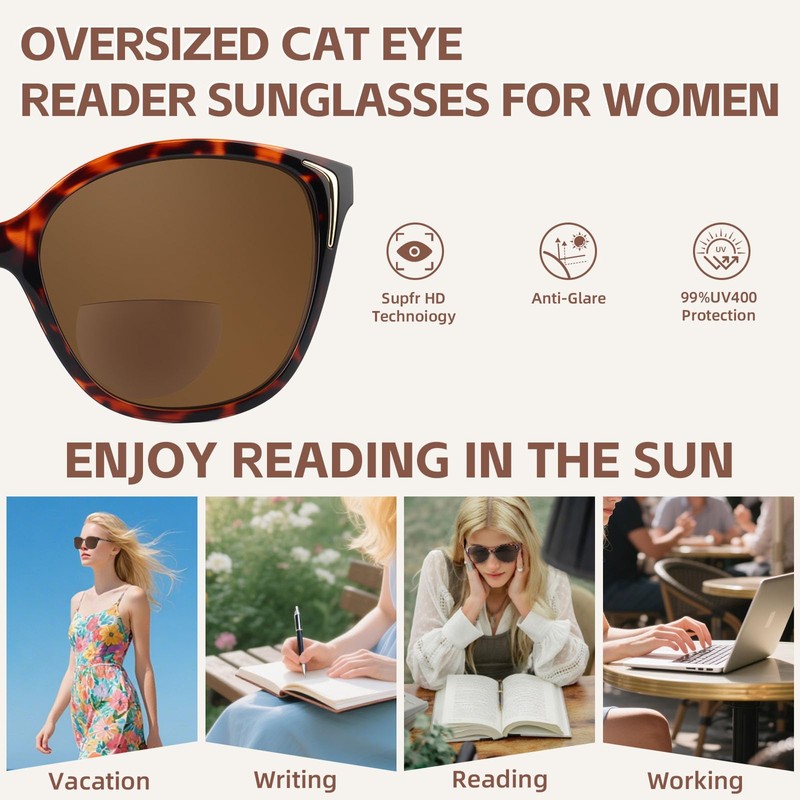 - 2 in1 Bifocal Sunglasses- Bifocal Lens Pair with UV400 Protection and built in reading prescription. Cat eye frame provides distance vision up top and reading lenses below ideal for phones, books, and car dashboards. Your essential all day sun companion for the beach, driving, and outdoors