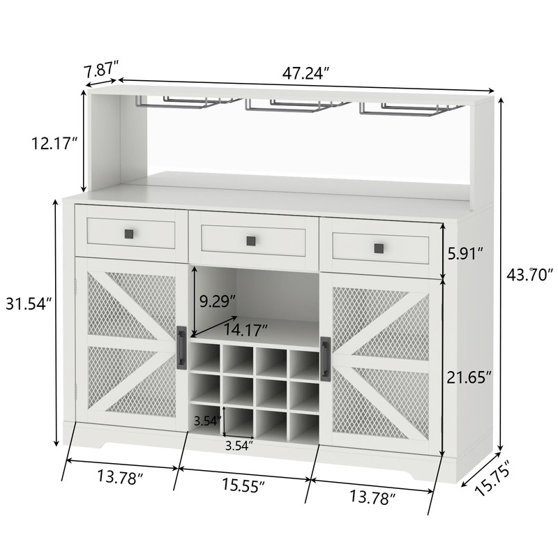 - [Large Capacity Storage Cabinet] This Wine Bar Cabinet comes with 12-grid wine rack, 2 large mesh door storage cabinets, and 2 open storage cubbies. In addition, hanging wine glass holder & hooks for storing your glasses, coffee cups and other kitchen items easy to find and access.The spacious desktop can accommodate household appliances such as coffee machines, keeping everything organized and in order.Whether you're brewing a cup of coffee in the morning or drinking with your family and friends at night, this versatile storage cabinet can meet your needs at different times and create memorable moments for you and your loved ones.