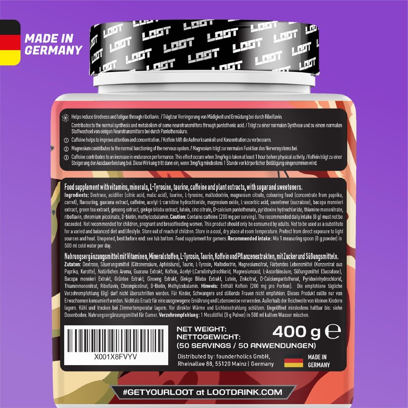 - Designed for gamers, made in Germany: LOOT Game Booster is more than just an ordinary gaming booster. Gamer Supps from Germany, designed to increase your performance. This gamer drink is your reliable companion for maximum concentration and ultimate focus during your sessions.