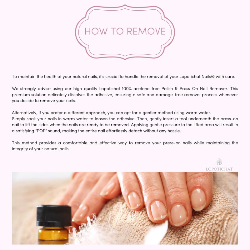 - 💖 SEAMLESS REMOVAL EXPERIENCE: Say farewell to tedious removal methods! Lopotichat offers a seamless removal experience with their 100% Acetone-Free Glue Remover (sold separately), formulated for easy detachment without damage, making your nail transition effortless and stress-free.