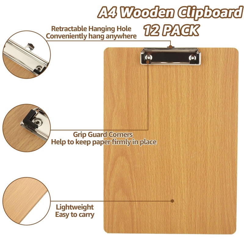 LOPYXBR Pack of 12 A4 Clipboards, A4 Wooden Writing Board with Metal Clip and Concealed Hanging Hole, Clipboard A4 Wooden Clipboard for Office, School