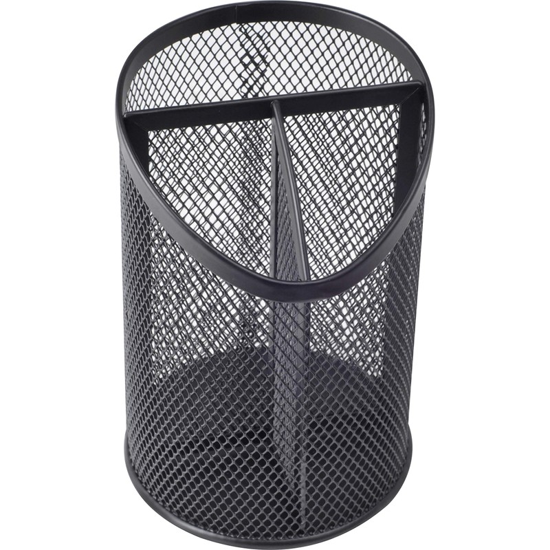 Stay organized and keep your writing utensils within easy reach with this divided pencil cup. Durable, metal construction securely supports and contains a variety of supplies for efficient, lasting organization. Rolled rim is smooth to the touch to prevent snagging and ensure safe handling. Pencil cup is perfect for organizing pens, highlighters, pencils, markers and more.