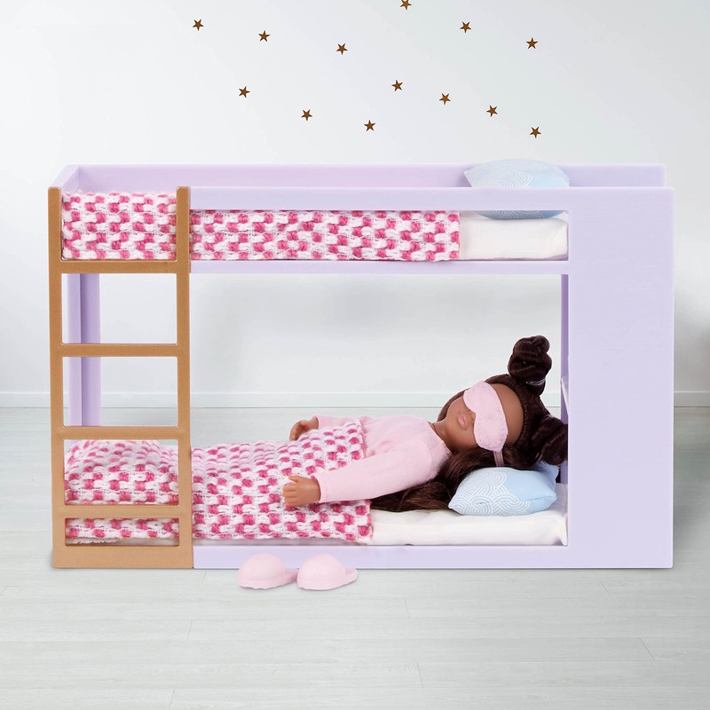 - Mini Doll & Bunk Bed Set: Get a good night’s sleep with Tania! This 6-inch mini doll comes with a cute pajama set, pretty pink slippers, and a matching eye mask.