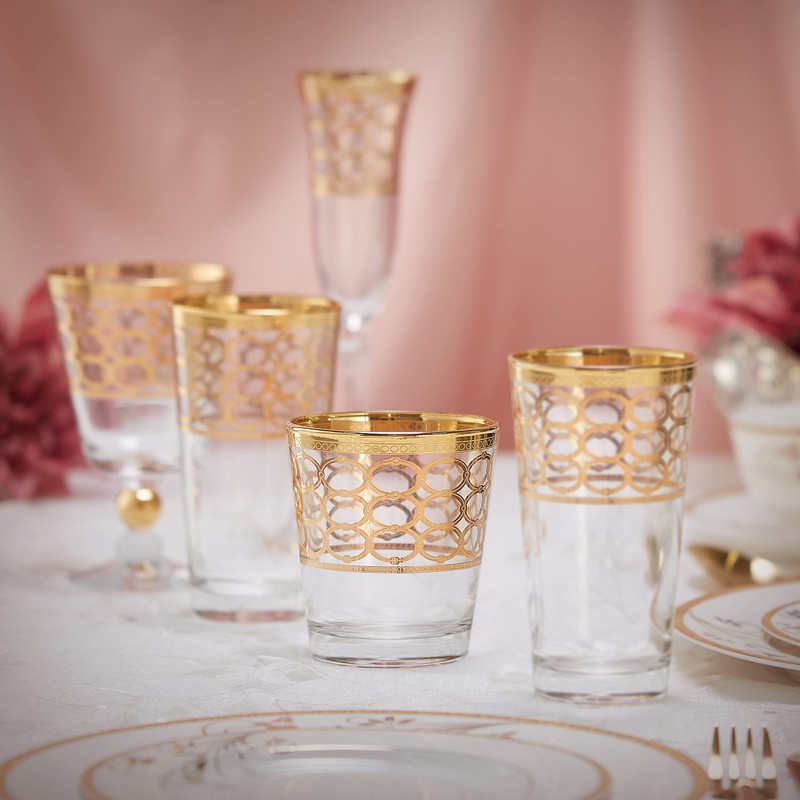 - Bright vivid gold rings create a beautiful contrast to the glass. A very high end luxurious look and feel to this tumbler. Night weight and very good feel in the hand. Looks elegant on charming on any table setting.