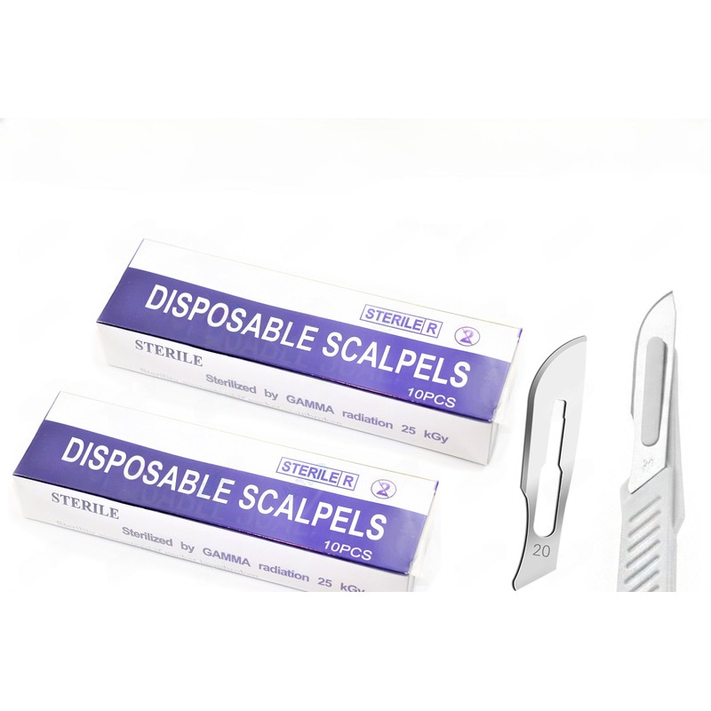 - SET INCLUDES ONE EACH OF THE FOLLOWING: ~2 PACK ( 20 PCS ) STERILE DISPOSABLE SCALPEL BLADES #20 WITH PLASTIC HANDLE FOR SINGLE USE WHITE COLOR INDIVIDUALLY FOIL WRAPPED~