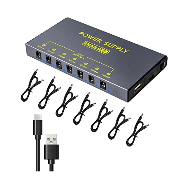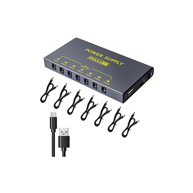 - 7 Individual Output: A universal guitar power supply for all battery-operated guitar pedal effects.This guitar power supply with AC 100v-240v input;6x9V 100mA guitar effects and 1 adjustable 9V 300mA, 1 x 5V 1A USB,the guitar pedalboard power adapter is designed for effect pedal
