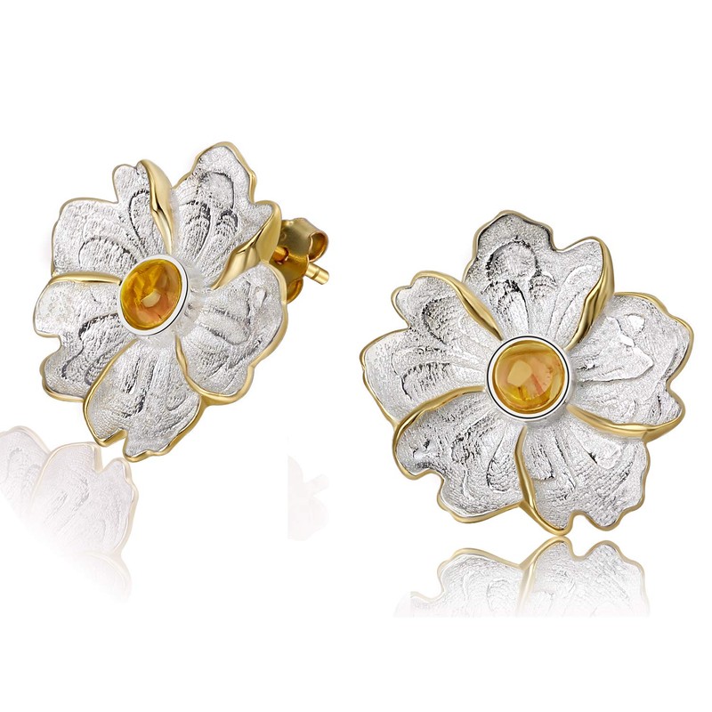 Lotus Fun S925 sterling silver stud earrings natural stone peony flower earring stud handmade unique jewellery for women and girls, Sterling Silver, Yellow