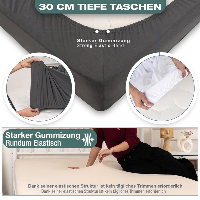 - LARGE SIZE CHOICE & PERFECT FIT: Our sheets are available in four different sizes and offer a firm and stable fit on beds up to 30cm thanks to their highly elastic structure.