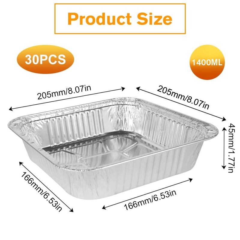 Lotvic 30 Packs Aluminum Foil Trays, 8 Inch Square Foil Baking Trays, Reusable Foil Air Fryer Liner, Disposable Foil Trays Containers for Baking, Cooking, Roasting, Storing (30 Packs, 8inch/1400ml)