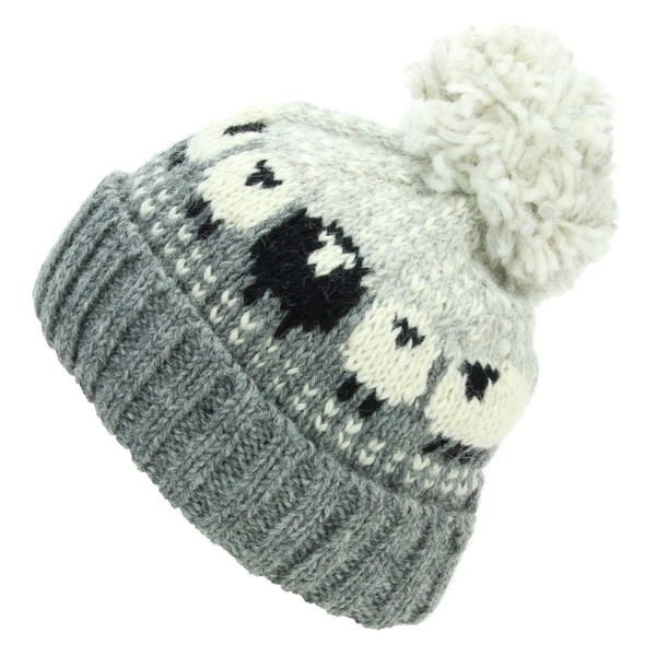 LOUDelephant Wool Knitted Bobble Hat with Sheep Design, gray, Einheitsgröße