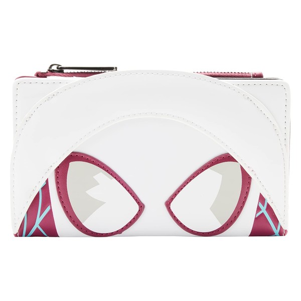 This Loungefly Marvel Spider-Man Spider Gwen Cosplay wallet features applique, embroidered, and printed details.