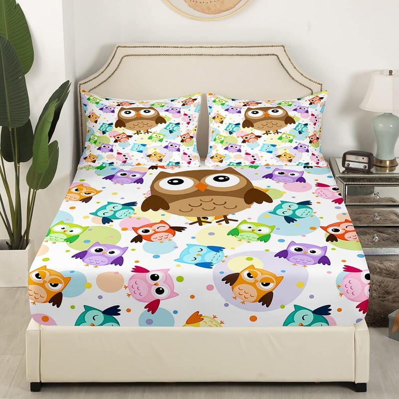 Loussiesd Children's Cute Owl Fitted Sheet Cartoon Owls Fitted Sheet 90 x 200 cm for Children Boys Girls Teenagers Decor Colourful Bird Decor Bed Sheet Set 3D Animal Printed No Flat Sheet 2 Pieces