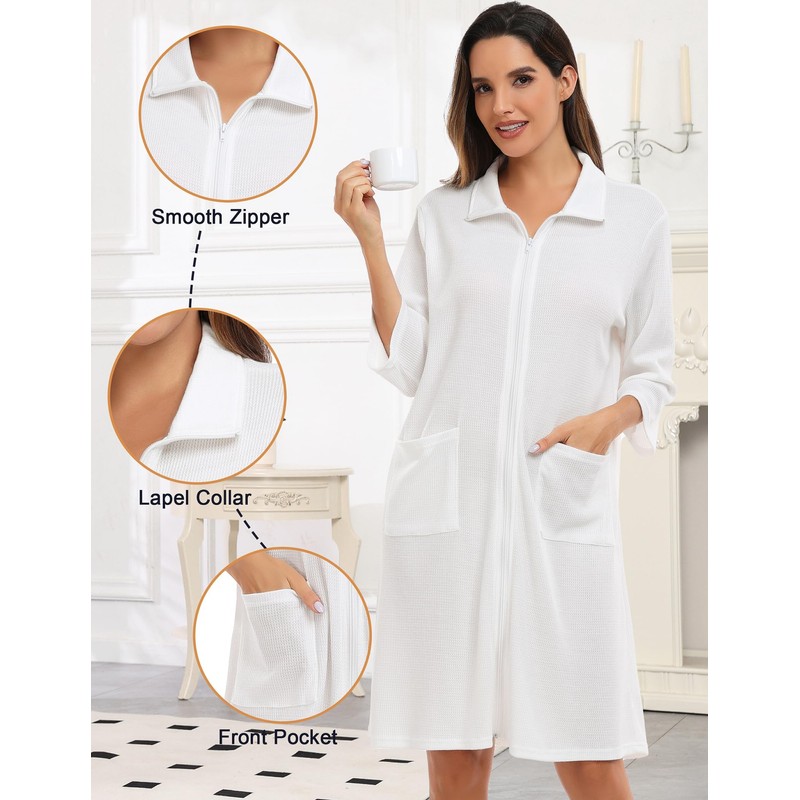 • 【Zipper Front Robe Design】Full Zip front waffle dressing gowns are easy to put on and off, and the convenience of a zipper allows your robe to stay securely closed and kept private.Suitable for any body type. The robe features 3/4 sleeves that are perfect for doing dishes, other chores, or washing one's hands. Smooth zipper house dress won't mess up your makeup or hair when taking it off or getting dressed.