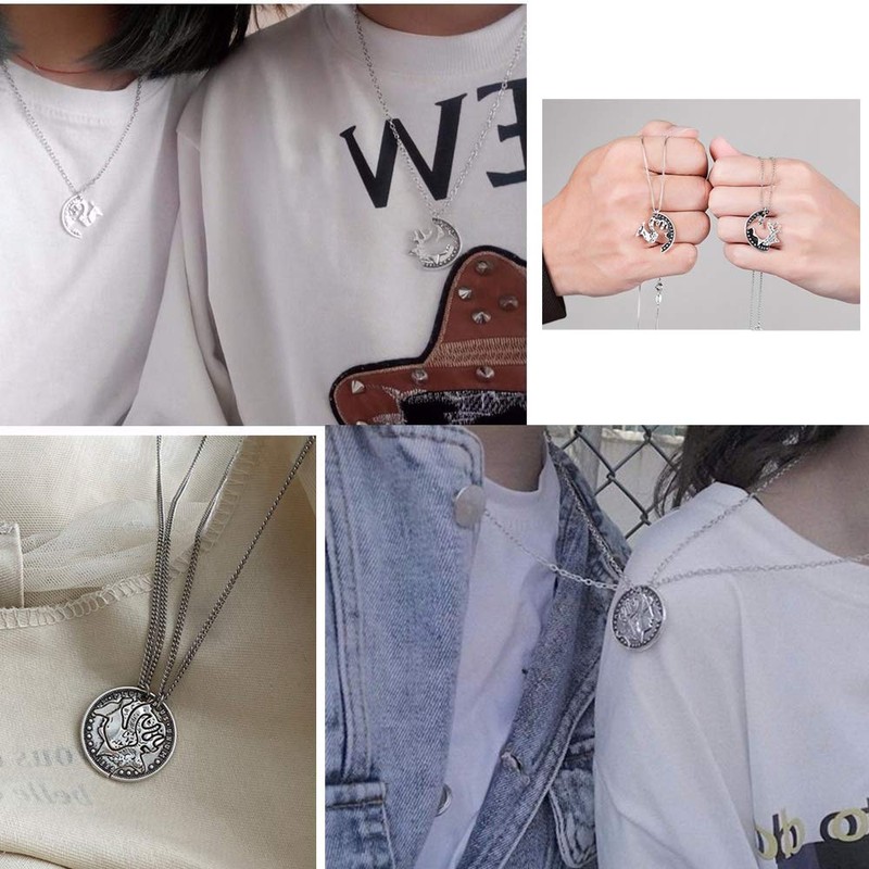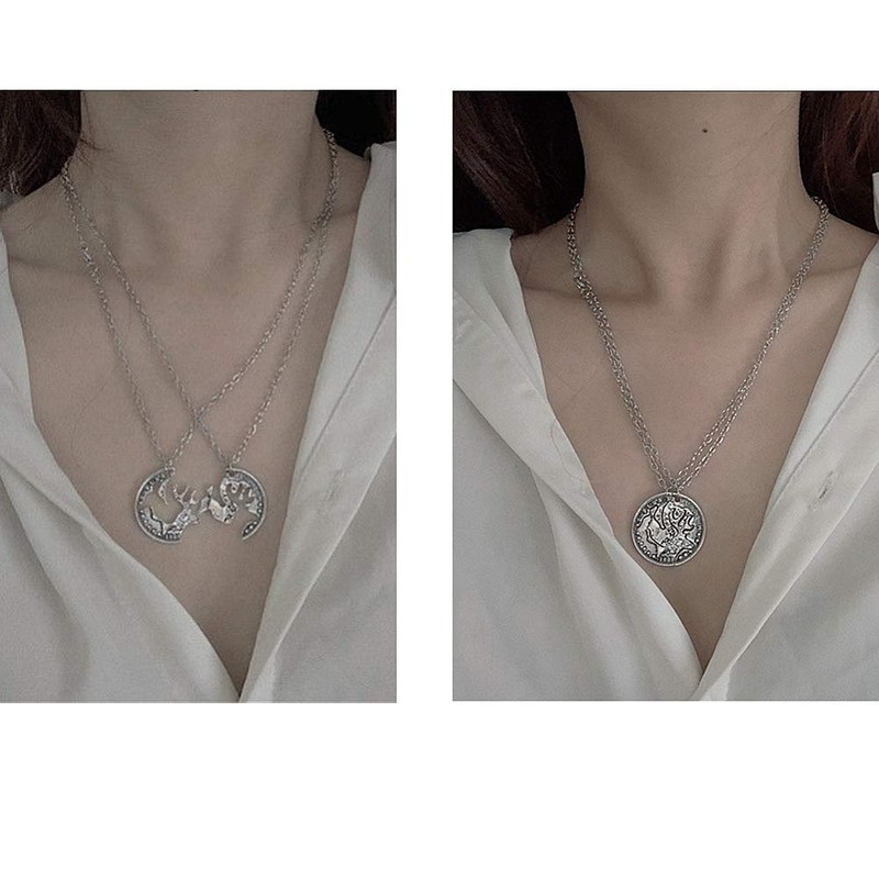 Love Elk Interlocking Necklace Set for Women Men Couples Stainless Steel Quarter Coin Deer Heads Pendant Chain Relationship Necklaces Valentine Anniversary Jewelry Gift for Friends