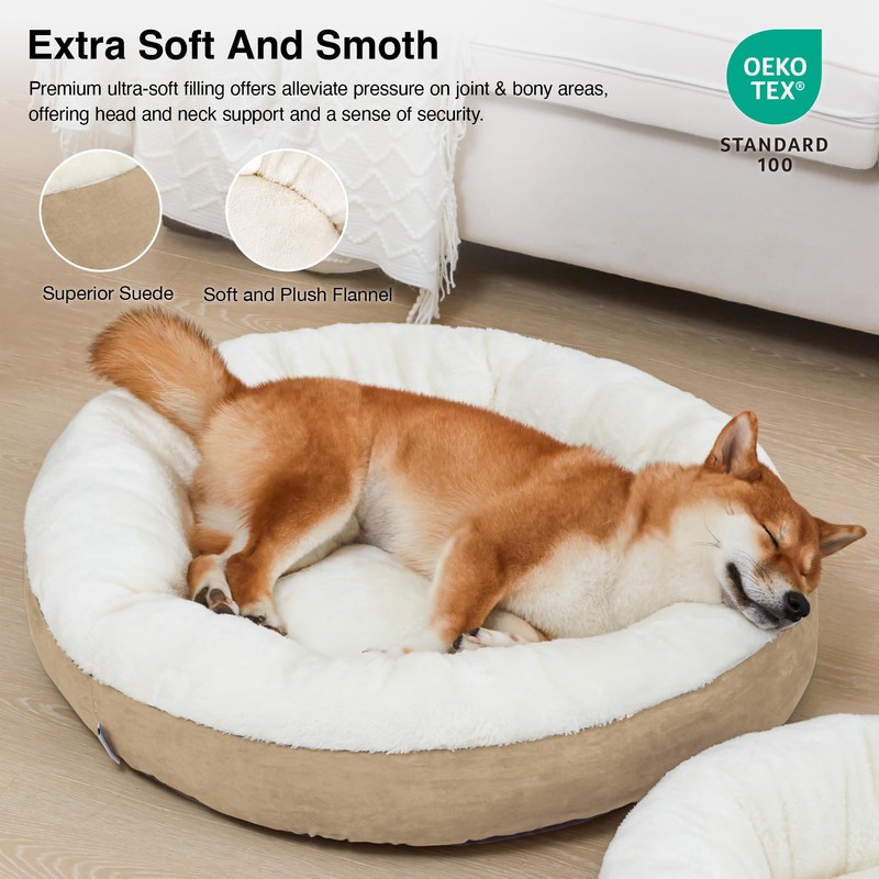 - Donut Cuddler Shape: The round dog bed allows pets to curl up while the raised rim creates a sense of security and provides head and neck support. Premium ultra-soft filling offers joint and muscle pain relief, is a great choice for elderly or sick dog pets. The 30 inch round pet bed is perfect for large dog and other pets up to 45 lbs.