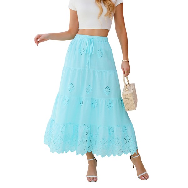 Love Welove Fashion Women's Boho Maxi Skirt - 100% Cotton Embroidered Eyelet, Flowy Tiered A-Line, Elastic Waist, Summer Beach Long Skirt Aqua Blue