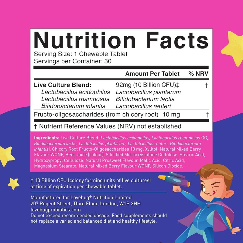 • Tasty & Easy to Chew – This delicious, berry-flavored fiber supplement for kids is easy to chew and taste like a treat, even to the pickiest of eaters Sugar-Free – Being completely sugar free, these chewable probiotics kids ensure the benefits aren't cancelled before they reach the tummy, effectively Uncompromising Quality – Lovebug kids probiotics are third-party tested and made in the USA in cGMP-certified facilities, ensuring the highest quality for your child's health and development
