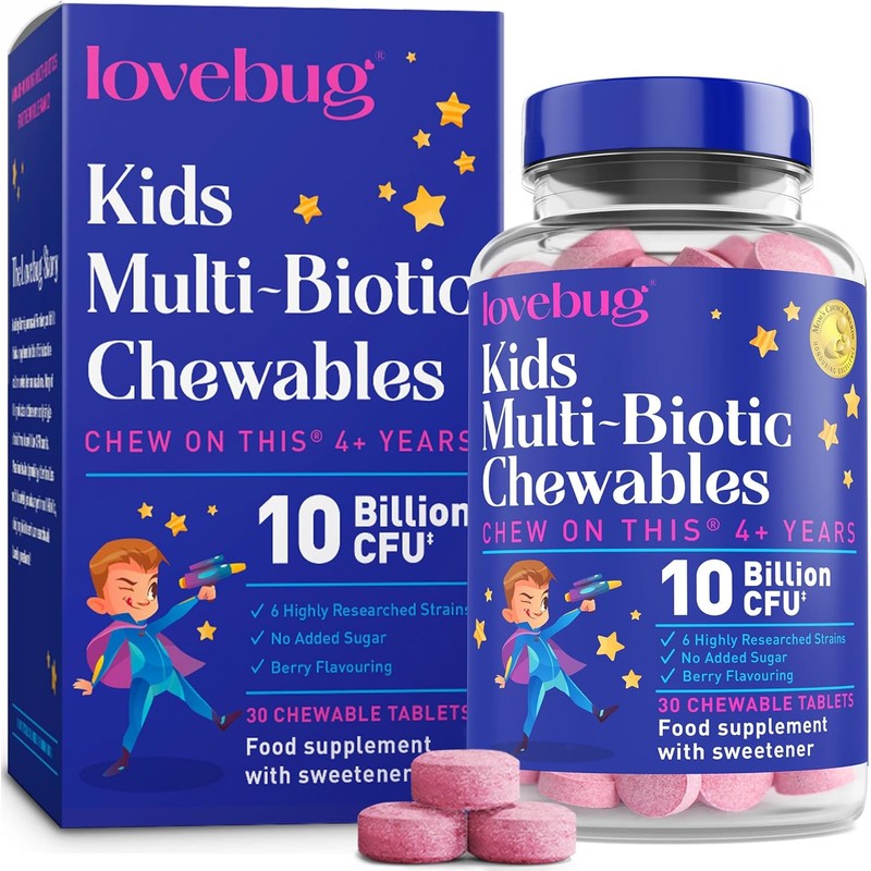 • Award-Winning Kids Probiotic Chewables – Lovebug Chew On This is a daily supplement for ages 4+ 10 Billion CFU Per Serving – With a gentle, multistrain formula. The added kids fiber feeds the probiotics for multifaceted support Allergen-Free – Lovebug probiotic for kids is non-GMO, vegan, and free from artificial colors, flavors, preservatives, and the 8 major allergens*. Plus, they're shelf-stable, requiring no refrigeration