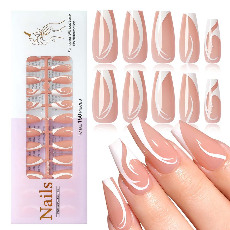 LoveHome 150pc French Tips Press on Nails Long Coffin Fake Nails with Glue Tab, Naked Long Nails Press on Nail Coffin Glue on Nails Swirl French Acrylic Nail Artificial Fingernail for Women Girls