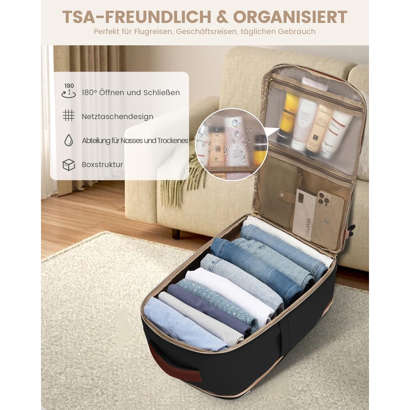 - MULTIPLE COMPARTMENTS AND POCKETS Equipped with 4 compartments and 14 pockets, this carry-on bag offers a separate laptop compartment for devices up to 17 inches for secure protection of your notebook. In addition, 3 small, square storage bags are included (1 toiletry bag, 1 clothes organiser, 1 shoe bag) that help you systematic packaging and keep everything neatly in place