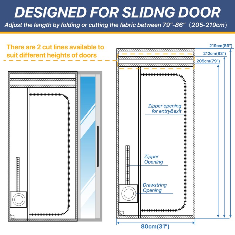 - ❄UNIVERSAL FIT: LOVIGA Patented Portable AC Sliding Door Vent Kit measures (Width)31x86 inch (Length) , the length can be adjusted between 80~86 inches to fit your SLIDING DOOR, supporting dual hoses of max 5.9 inch diameter. It also has a full size zipper opening for you to entry&exit